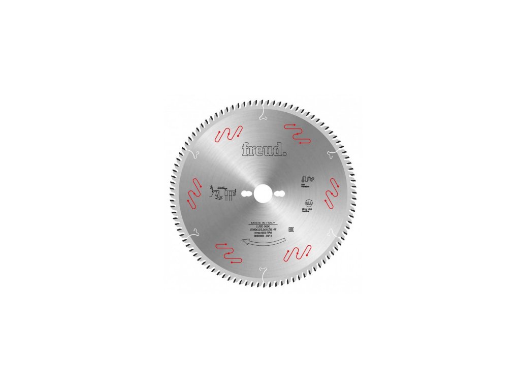 Pílový kotuč Freud na formátovanie laminovanej drevotriesky s použitím predrezu. Vysoká životnost ostria, velký počet opakovaných ostrení